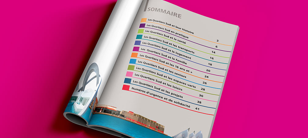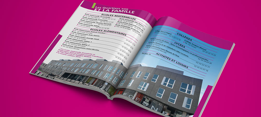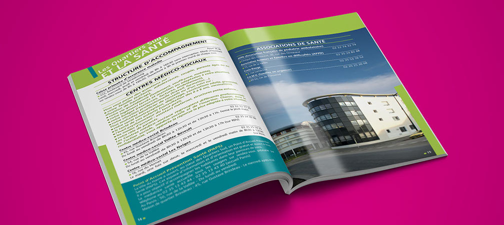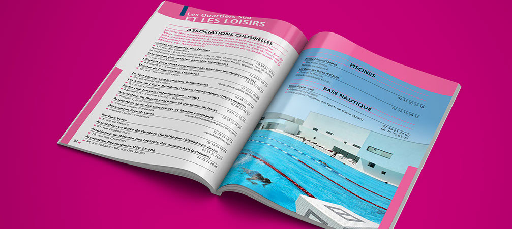 GUIDE PRATIQUE 40 PAGESLE HAVRE - QUARTIERS SUD Création d'une identité visuelle et mise en pages d'après textes et photos. Travail réalisé pour une agence de communication havraise Découvrir le guide pratique des quartiers sud